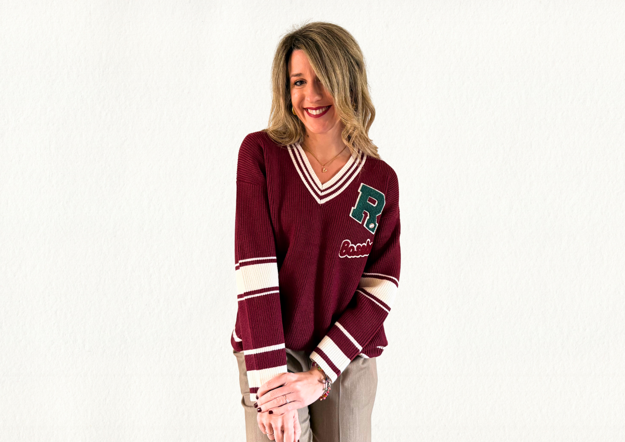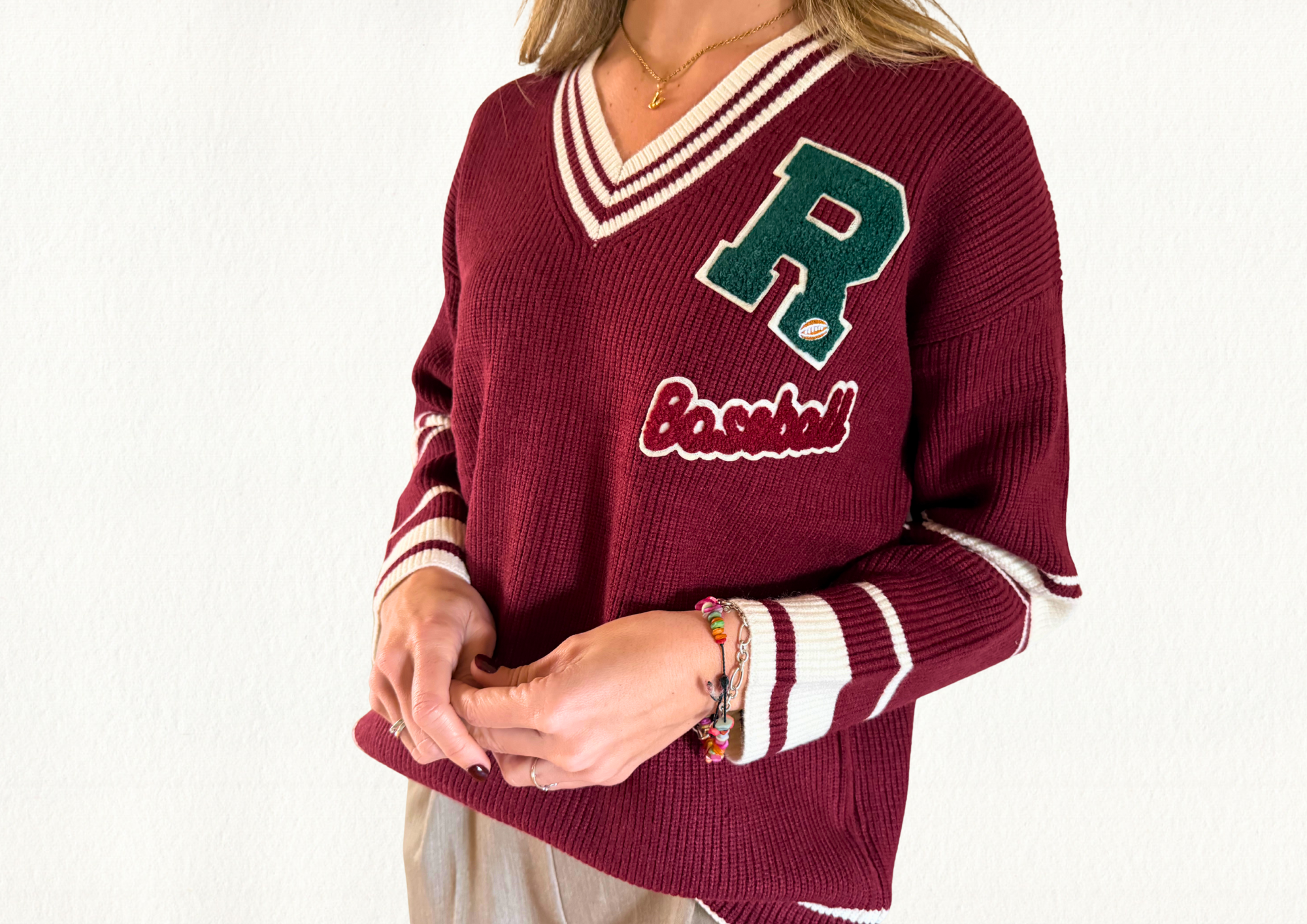 Jersey de punto color burdeos estilo college con cuello en pico. Detalles en tono crudo y verde botella. Largura hasta la cadera.