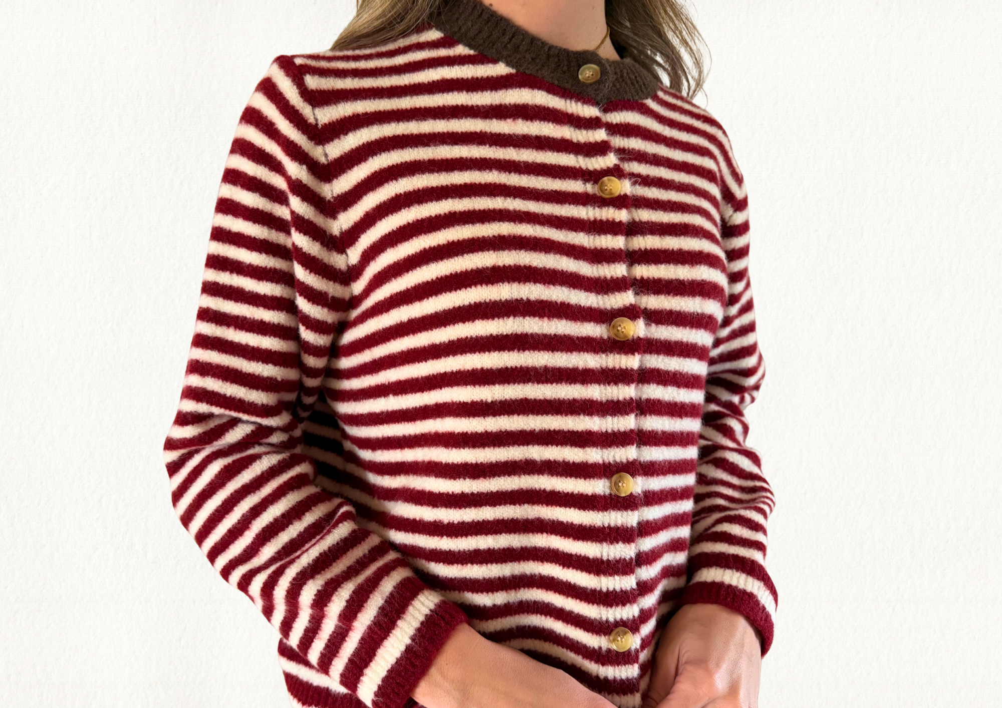 Chaqueta de punto de rayas en tonos burdeos y blanco. Botones dorados como detalle en la parte central. Cuello en tono marrón chocolate.